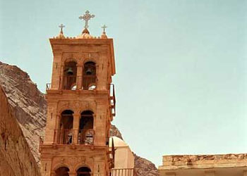 Внутри крепости — нагромождение строений, плоских и двускатных крыш, маленьких полусферических куполов. Колокольня XIX в. в итальянском стиле, построена на русские деньги. Висящие на ней колокола, сзывающие сегодня на молитву синайских монахов, отлиты в России. Русские цари и князья, епископы и купцы, простые паломники делали многочисленные вклады в монастырь Синайской горы.Обширный холм с разрушенной часовней здесь называют русским. В прошлом веке на нем стояли палатки, в которых жили паломники из России.